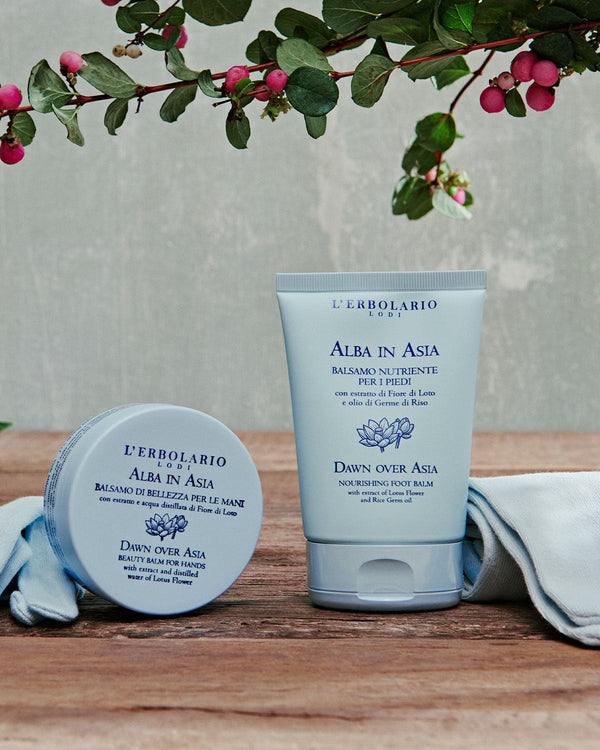 The Lotus Flower, which symbolises grace, elegance and purity in Asian cultures, takes centre stage in the L’Erbolario Dawn over Asia line: a women’s perfume with fresh, floral and citrus notes, beauty treatments for the body containing cosmetic ingredients derived from Lotus Flower and Rice, and home fragrances with clear notes. For your beauty routine, choose our shower gel for gentle cleansing, our scrub butter for light exfoliation, and our perfumed body cream for a moisturising effect, as well as treatments for your hands and feet.