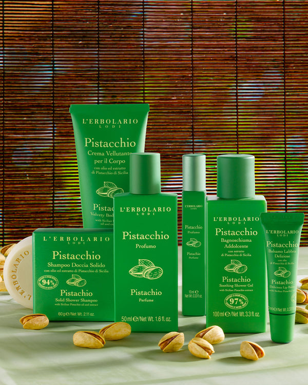 Looking for a summer fragrance? Discover Pistachio and treat your senses to a true delight: this unisex Perfume is both gourmand and fruity, and is also available in a handbag-sized version. The body care products, formulated with Sicilian pistachio extract and oil, come in handy travel sizes, so you can take them with you wherever you go! Discover the Soothing Shower Gel, perfumed Body Cream, Delicious Lip Balm and Solid Shower Shampoo!